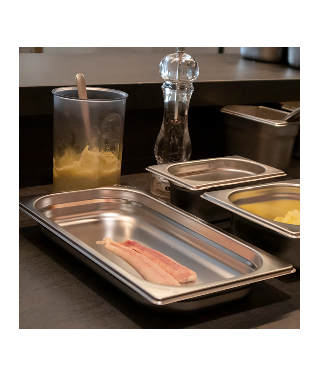 - O sistema de contêiner Gastronorm edenox é baseado nos modelos de medição GN 2/1 (650 x 530 mm) e GN 1/1 (530 x 325 mm). Com essas medidas como base, a linha edenox possui as subdivisões necessárias para atender aos requisitos dos modernos estabelecimentos gastronômicos: GN 2/3, GN 1/2, GN 1/3, GN 1/4, GN 1/6 , GN 1/9. Este sistema foi projetado e fabricado sob a norma europeia EN-631. A aplicação desta norma ajuda os contêineres Gastronorm a serem utilizados internacionalmente em qualquer tipo de dispositivo que utilize essas dimensões (armários de refrigeração, fornos mistos, fornos de convecção, carrinhos de transporte, carrinhos de transporte, autoatendimento, etc.), adaptando-se às necessidades de cada estabelecimento. A rigidez das arestas, bem como seu desenho especial, garantem uma estabilidade perfeita em cada aplicação. Os amplos raios das cubetas permitem maior facilidade de limpeza e máxima higiene. Seu polimento eletrolítico (polimento eletrolítico) permite uniformidade máxima no acabamento de todos os modelos. Existe um modelo de cobertura para todas as necessidades (baldes planos, com alças, baldes e herméticos). O design estudado da vedação labial de silicone vulcanizada da tampa hermética faz com que o recipiente com os alimentos se feche de maneira segura e higiênica, com faixa de temperatura de -40 ° C a +180 ° C. As alças retráteis facilitam o manuseio e podem empilhar os contêineres sem perda de espaço, garantindo sua estabilidade. Em aço inoxidável AISI -304 18/10.