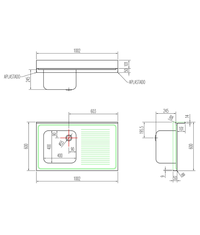 Bancadas de 600 mm de profundidade com pia totalmente soldada e backsplash de 100 mm de altura.