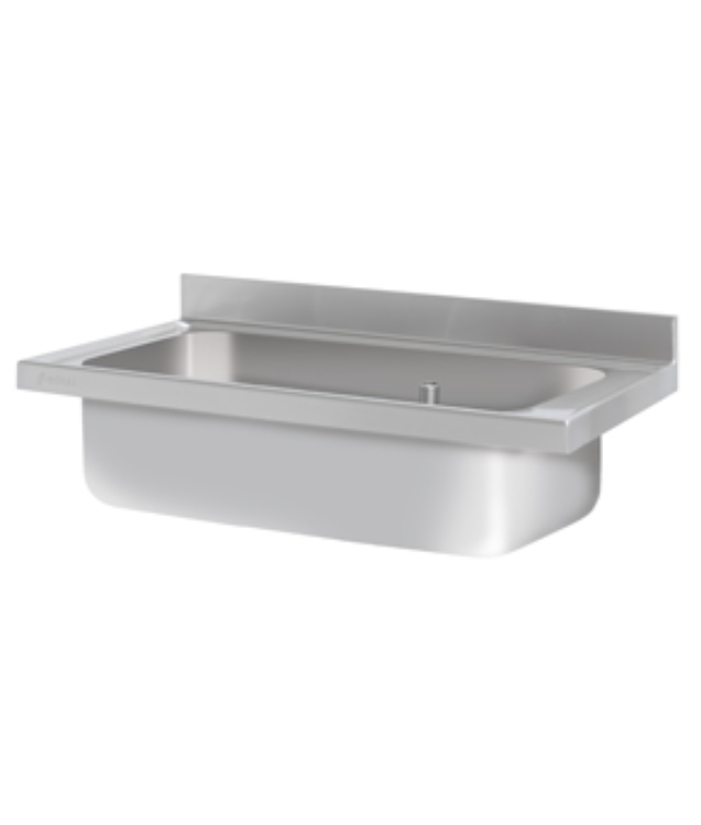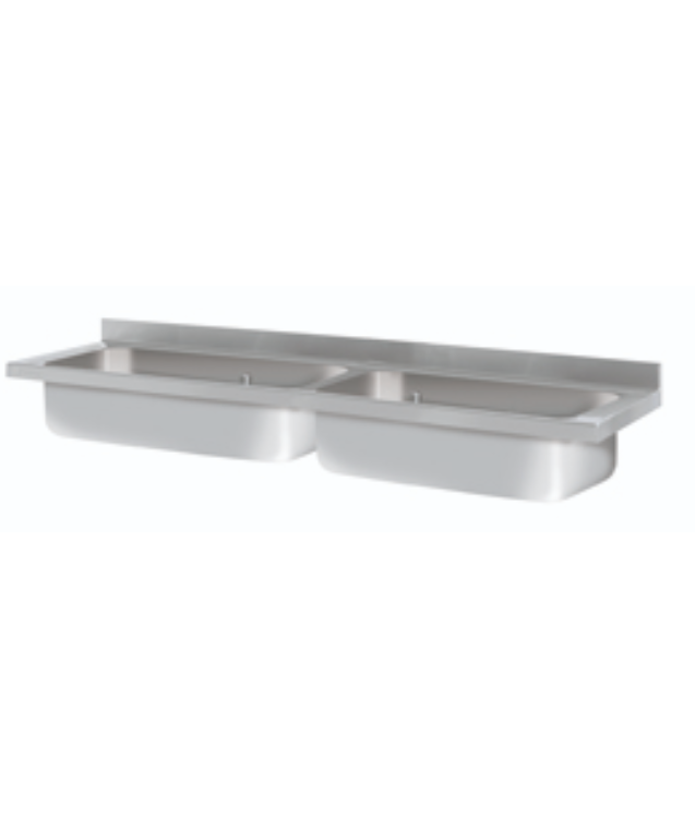 Bancada com 700 mm de profundidade com pias, painel traseiro com 100 mm de altura e painel frontal com 50 mm de altura. Totalmente soldado.