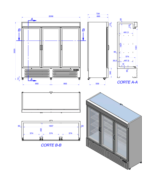 - O equipamento também é dotado de drenagem interna para facilitar a limpeza e manutenção. Cada porta vem com quatro prateleiras especialmente projetadas para apresentação de bebidas e alimentos, perfeitas para uso em supermercados e lojas de conveniência.