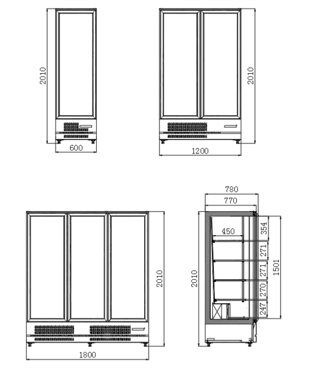 - 4 linhas de prateleiras maciças reforçadas com 500 mm de largura, em chapa pintada de preto (prateleiras extras disponíveis). São fornecidas 4 prateleiras por porta como padrão. Estas prateleiras são projetadas para apresentação de bebidas e alimentos, ideais para supermercados e lojas de conveniência.