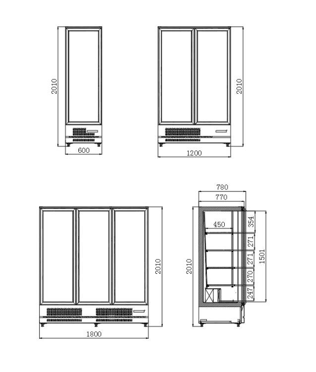 - 4 linhas de prateleiras maciças reforçadas com 500 mm de largura, em chapa pintada de preto (prateleiras extras disponíveis). São fornecidas 4 prateleiras por porta como padrão. Estas prateleiras são projetadas para apresentação de bebidas e alimentos, ideais para supermercados e lojas de conveniência.