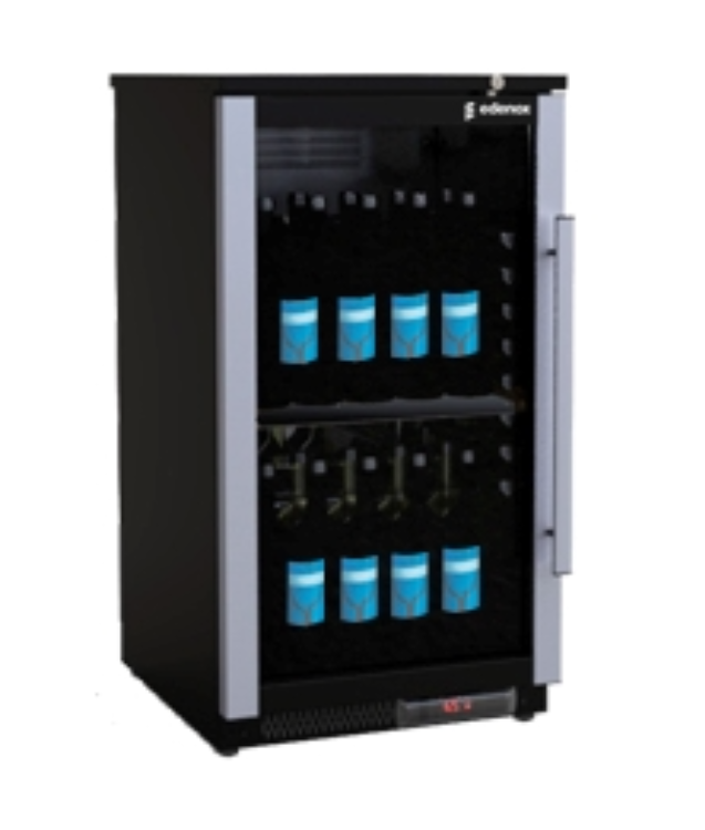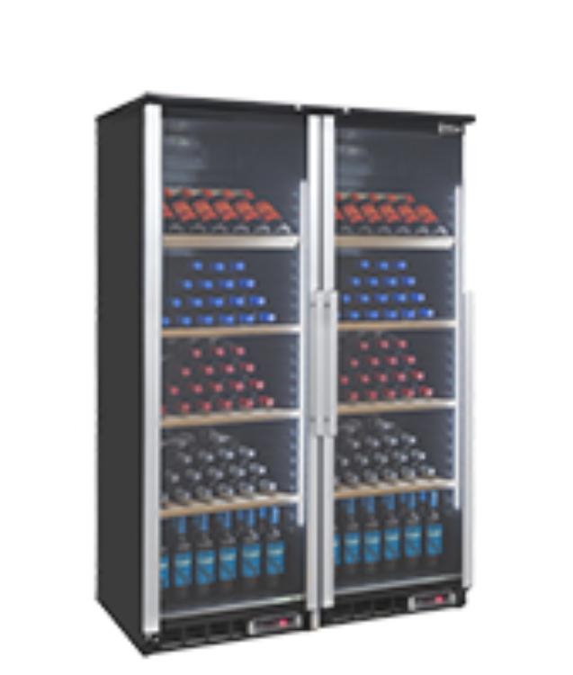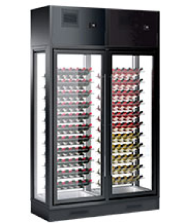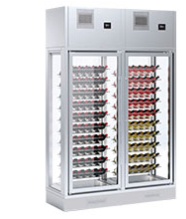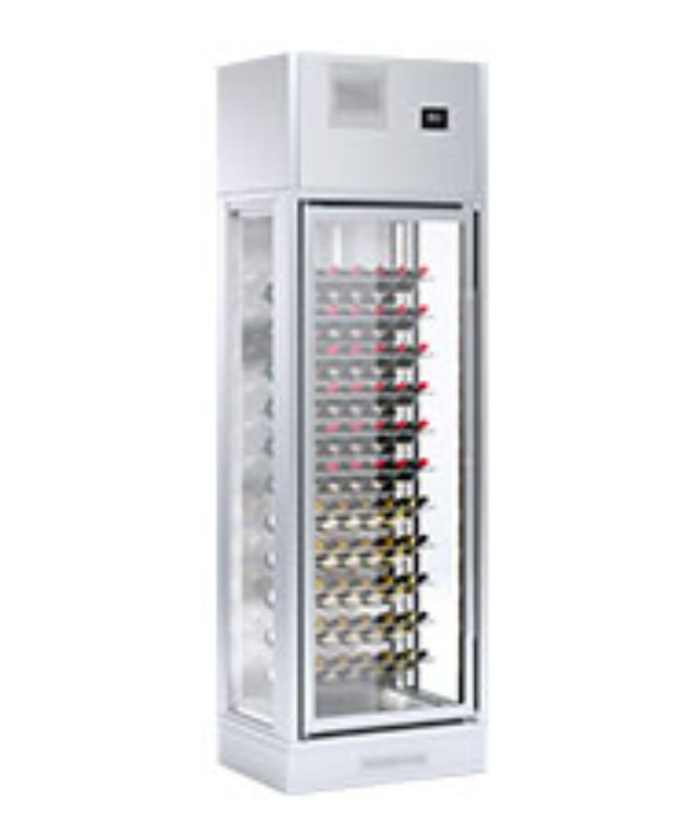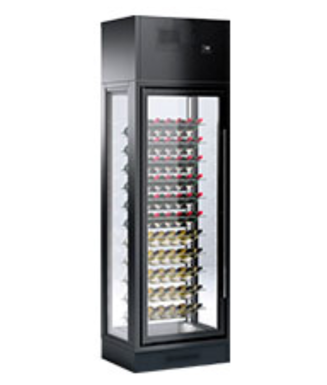 | – | Possui porta e está equipada com três prateleiras planas e uma inclinada em varão laminado preto, o que lhe confere capacidade para 72 garrafas de 0,75cl. Se as garrafas forem colocadas verticalmente em quatro prateleiras horizontais, a sua capacidade máxima é de 138 garrafas de 0,75cl. |